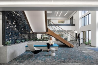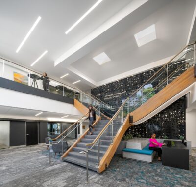 Each building’s lobby, restrooms, and elevators were renovated to include new finishes, lighting and code related signage. Facade treatments to the exterior bring a refreshed, new look to central entry areas leading to the lobbies. Improvement to the lobbies include new tenant entries, central mailbox area, and drinking fountain alcove, with new feature walls behind the existing central stairs. Restroom upgrades include new partitions and plumbing fixtures.