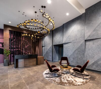 Conveniently located a short walk from Lake Merritt, two BART stations, and local bars and restaurants, the project is targeted towards a young professional demographic. Designed to create a luxury resort ambiance, the sophisticated interiors feature a palette of colors, textures, and finishes that synchronize with the contemporary architecture. Amenity spaces include a co-working lounge with reservable conference and meeting rooms - all fully equipped with the latest technology, elegant leasing office, bicycle parking with adjacent workshop, controlled access bicycle parking with adjacent workshop, pet washing and grooming station, 24-hour fitness and training facility, and a large event space.