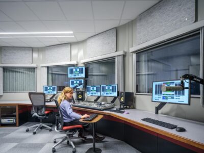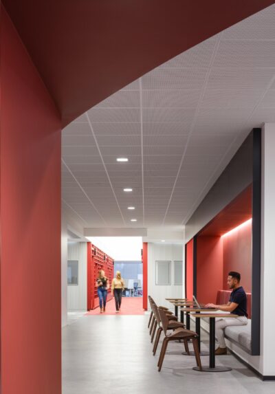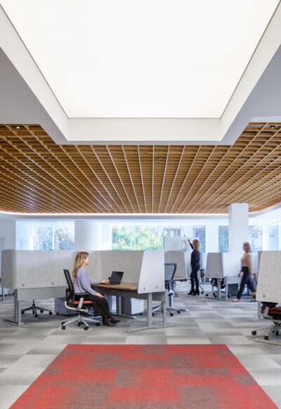 The renovation introduced a versatile mix of environments, including private but transparent offices, collaborative areas, and tiered bleacher seating designed to inspire connection and creativity.