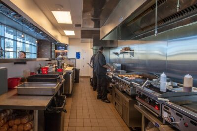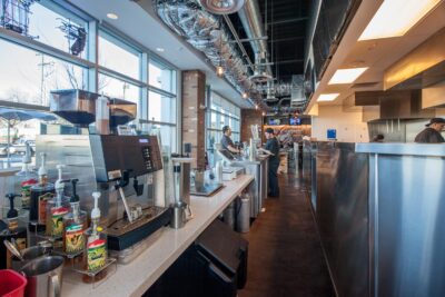 The new 2,600 square foot restaurant is located on the first floor of the California State Lottery Headquarters building and serves burgers, draft beer and Starbuck’s coffee. The space seats 68 people and features industrial-style architecture with open ceilings, exposed duct work, large screen TV’s, a unique large fan, custom graphics and the reclaimed wood crate finishes that make for a warm, exciting place to diner.