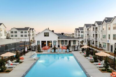 The layout centers around a network of interconnected paseos and courtyards, creating inviting outdoor spaces that encourage social connection and activity. Each building cluster offers its own unique gathering areas, while shared amenities include a community clubhouse, swimming pool, playground, and dog park—providing residents with a vibrant and family-friendly environment.